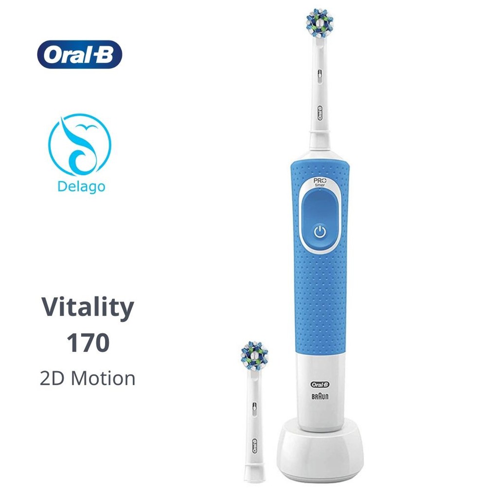 Bàn chải đánh răng điện Oral-B Vitality 170 CrossAction ( Màu xanh) - 2 đầu thay Tần số 7600 dao động trong một phútChế độ hẹn giờ chải răng được Nha sĩ khuyến cáo trong 2 phútĐi kèm 1 đầu bàn chải CrossActionĐi kèm đế sạcSử dụng điện 220 -240VSản xuất tại HungaryBàn chải đánh răng điện Oral-B Vitality 170 CrossAction ( Màu xanh ) 2 đầu thay được bảo hành chính hãng 24 tháng. Giá sản phẩm tại Delago đã bao gồm thuế theo luật hiện hành.